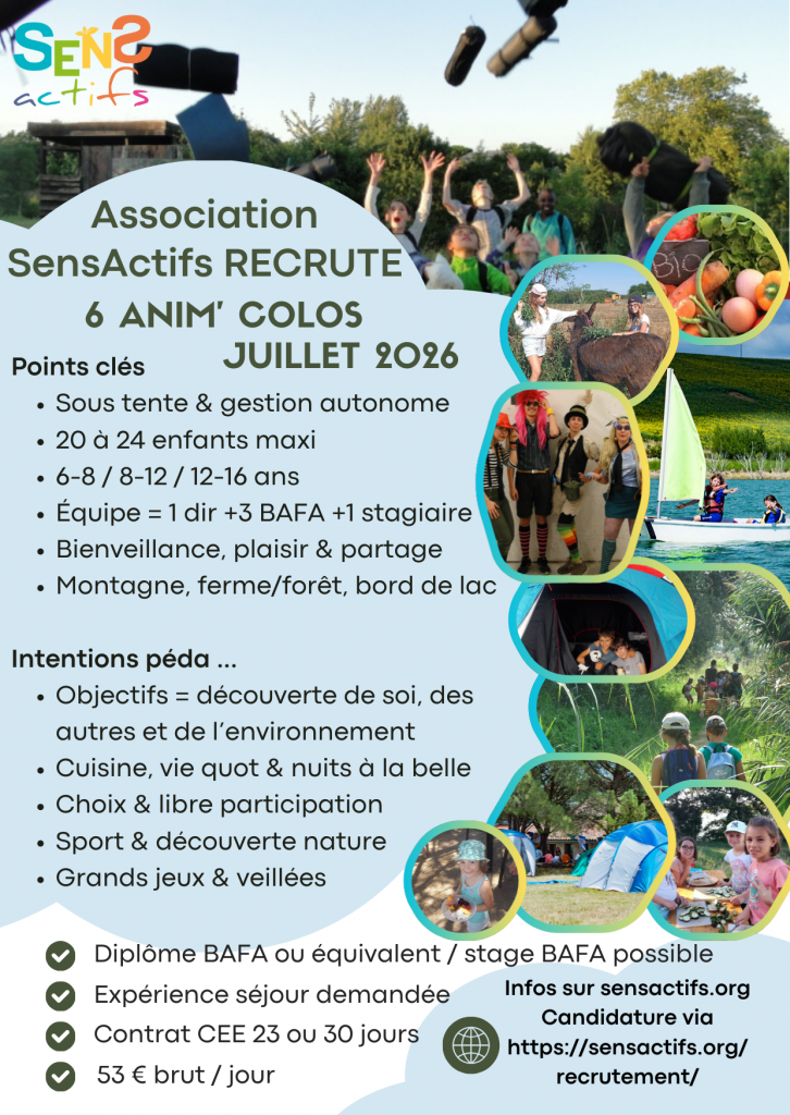 SensActifs recrute pour cet été! Vous aimez nos centres de loisirs et nos séjours de vacances, nos valeurs, notre projet… mais vous êtes trop vieilles ou trop vieux pour vous inscrire à nos colos?! Nous avons la solution 😉